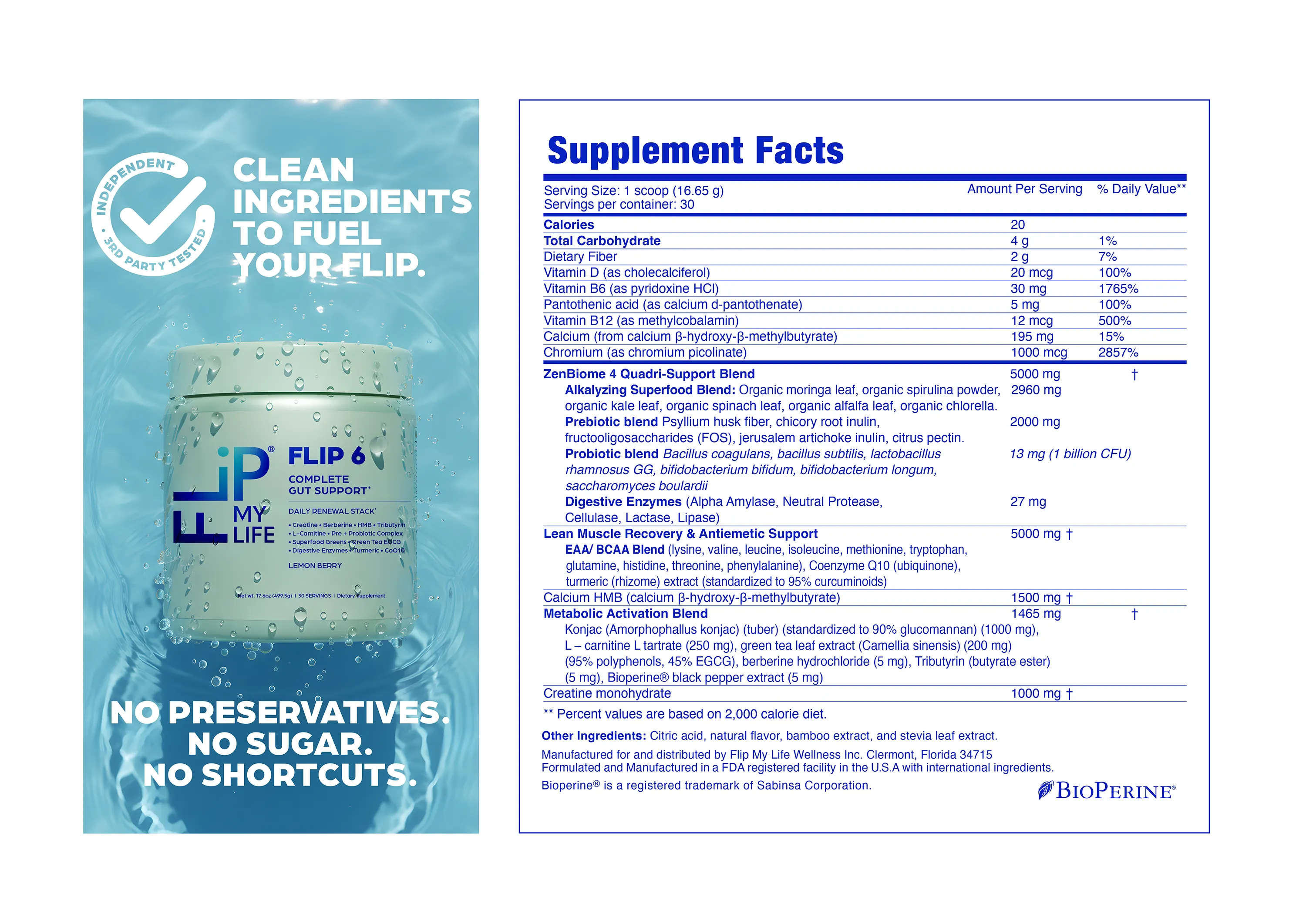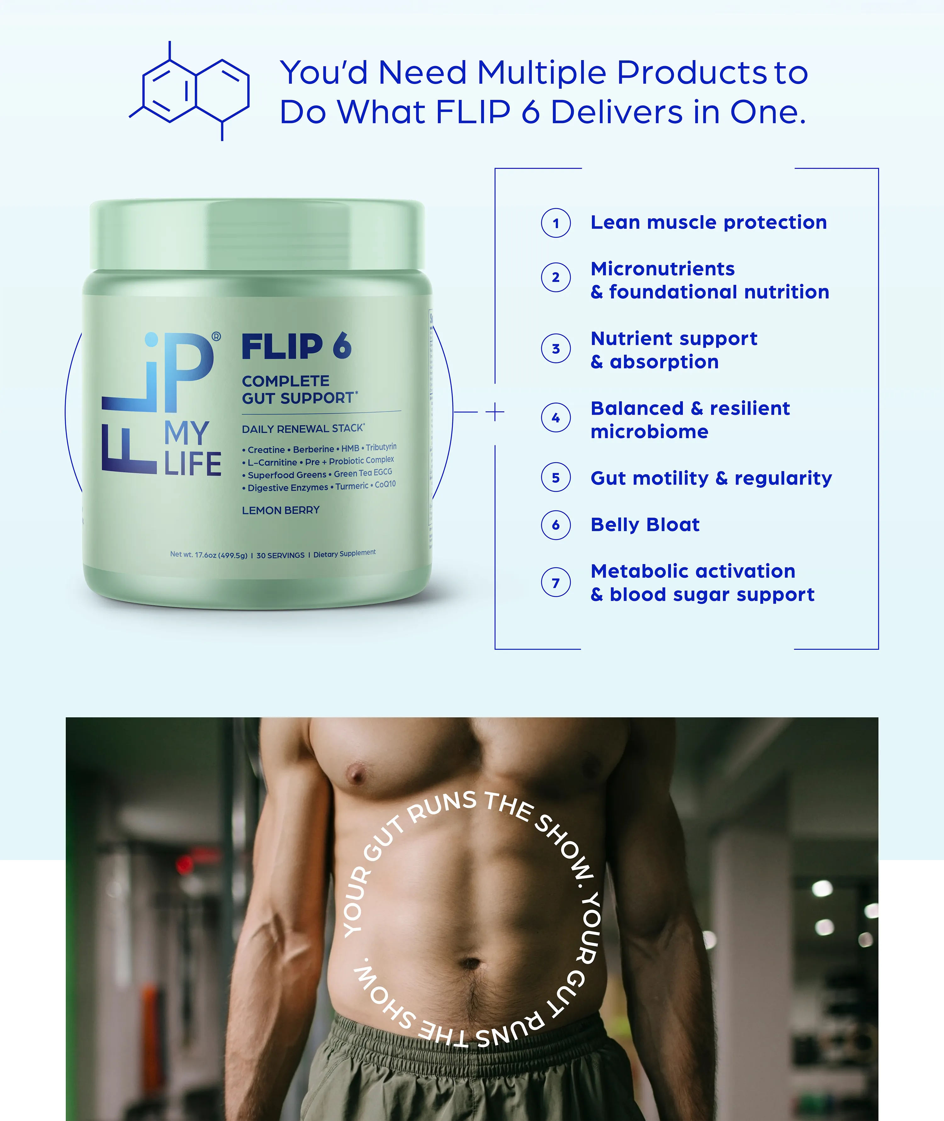 FLIP 6 is simple and refreshing to use—simply scoop one level serving of the powder into a shaker bottle or glass with 8-12 ounces of water, shake or stir vigorously until fully dissolved, and drink it daily for optimal gut renewal and support. The light, clean Berry Lemon flavor makes it easy and enjoyable, turning your routine into a quick habit that delivers comprehensive digestion, nutrient absorption, muscle protection, and metabolic benefits.
