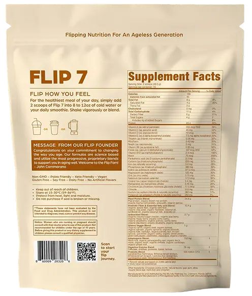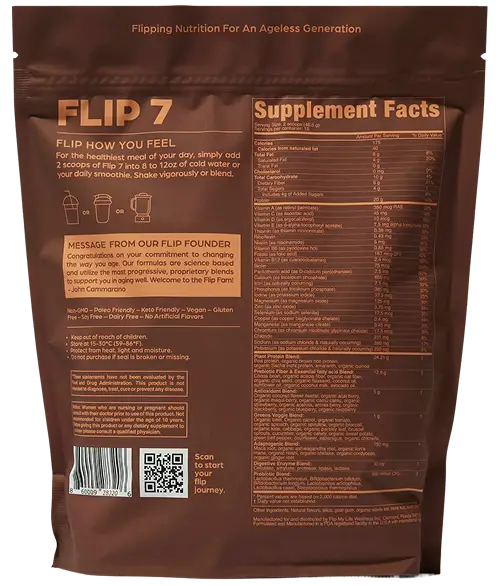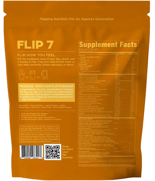 Beside the amazing taste and convenience, FLIP 7™ was created because less than 7% of Americans actually consume the proper daily amounts of protein, fiber, vitamins and minerals that their body truly requires as fuel for the day. Just one serving of FLIP 7™ contains an enormous contribution to your daily intake plus prebiotics and probiotics that support a healthy gut and ultimately an improved overall state of wellness. FLIP 7™ contains 7 Mega blends specifically designed to put you on your journey to achieving your goals without starving yourself on some ridiculous diet. Here at Flip My Life Wellness® we want every client to have their own Flip My Life® moment and it all starts with one decision to honor yourself and take that first step to fuel your body and mind. So, why should you take FLIP 7™ everyday as a meal replacement? Simply put, we guarantee that you will start to feel better in just 7 days, you will witness increased energy, an improved state of mind and ultimately become the best version of you.