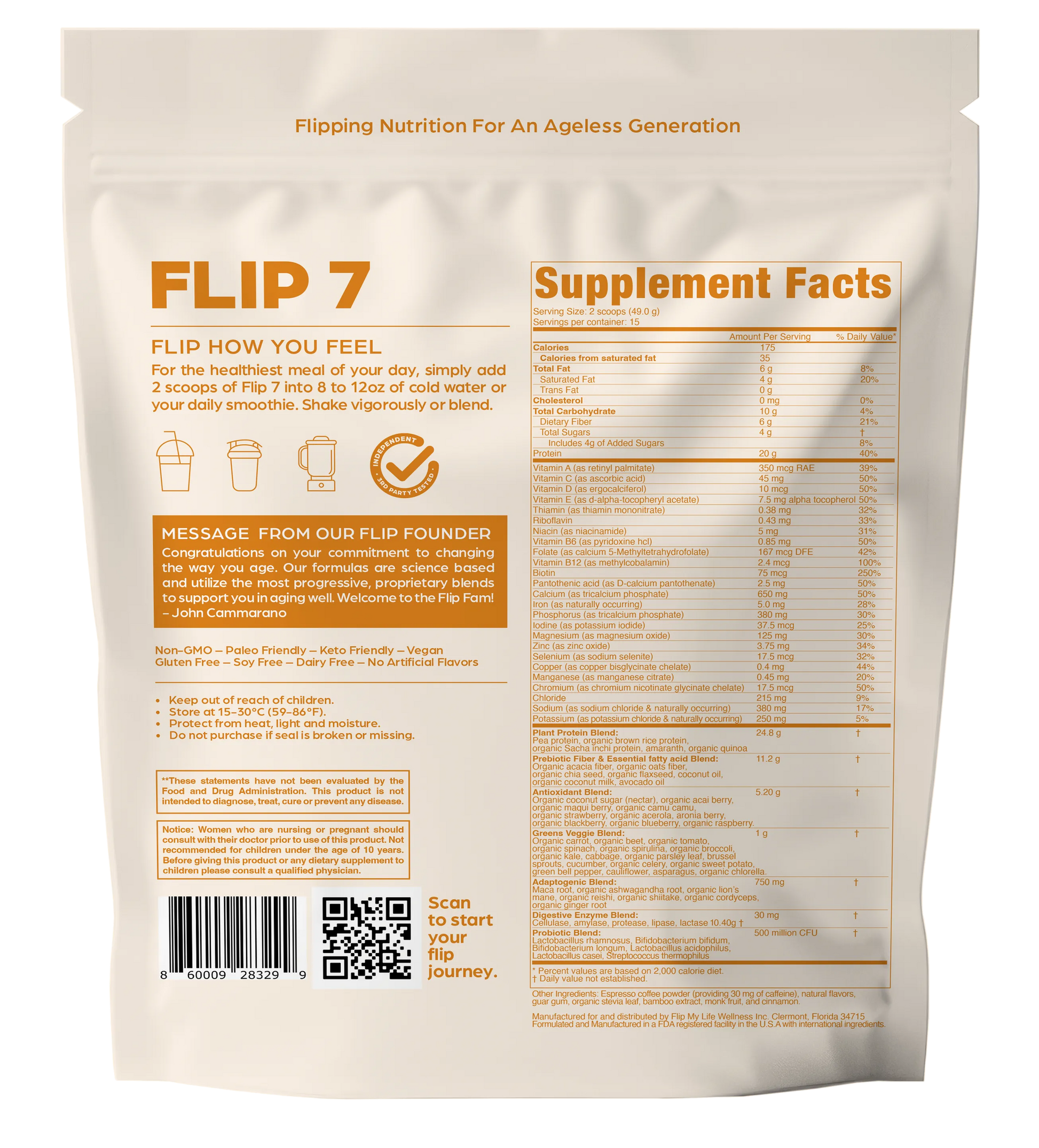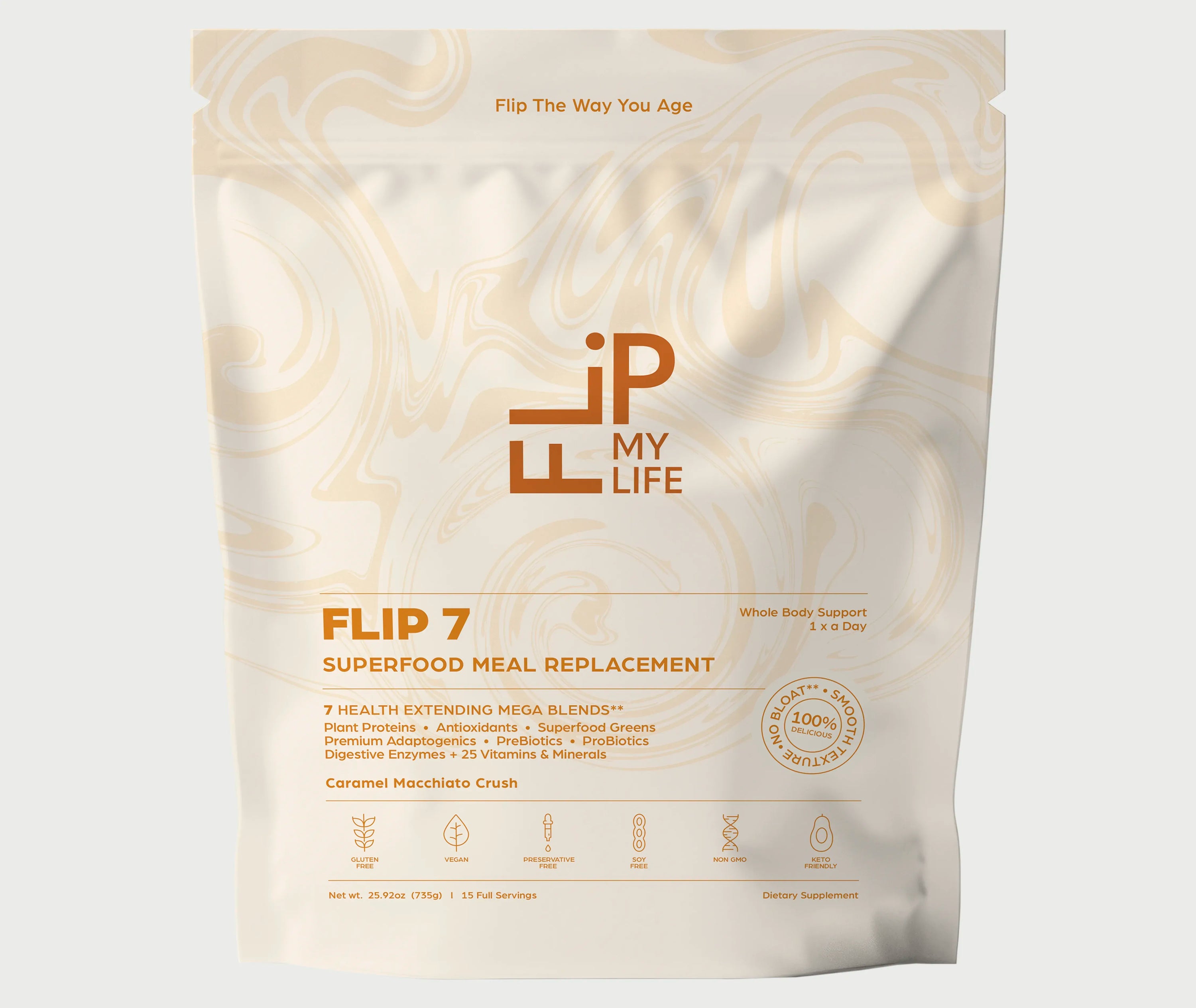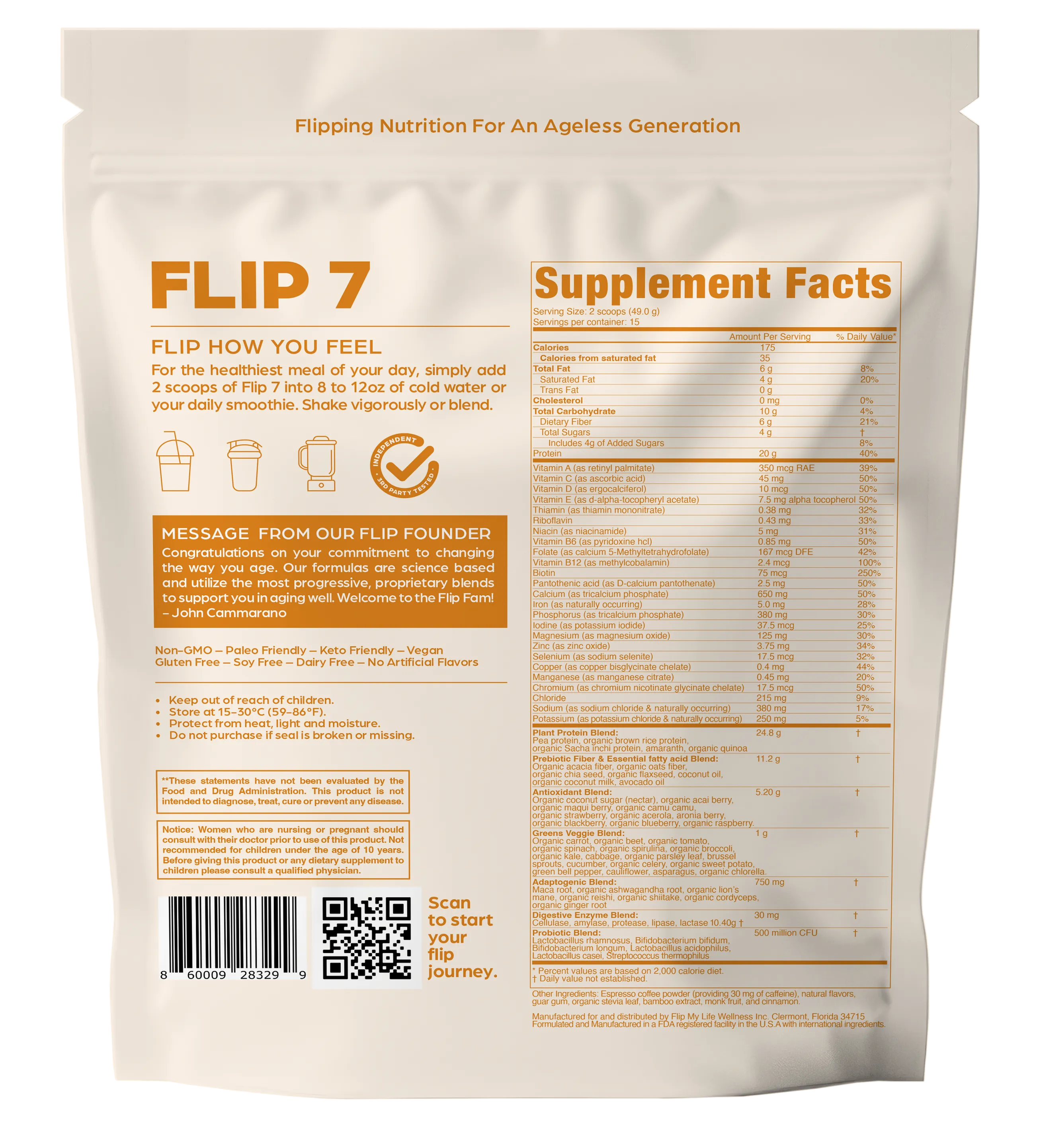 Feel better, fast with one shake a day. FLIP 7 is an unmatched, all-in-one meal replacement SUPER FOOD powder with the most nutrient rich balance of health extending blends formulated to support whole body and mind wellness.The vegan, plant based formula is made with proprietary doctor-tested blends and clean ingredients that work synergistically to enhance metabolism and provide all the super greens, adaptogens, prebiotics, probiotics, digestive enzymes, vitamins and minerals plus 20 grams of protein in each serving without bloat you get from other powders.No Bloat! 100% Delicious. Smooth, creamy texture.