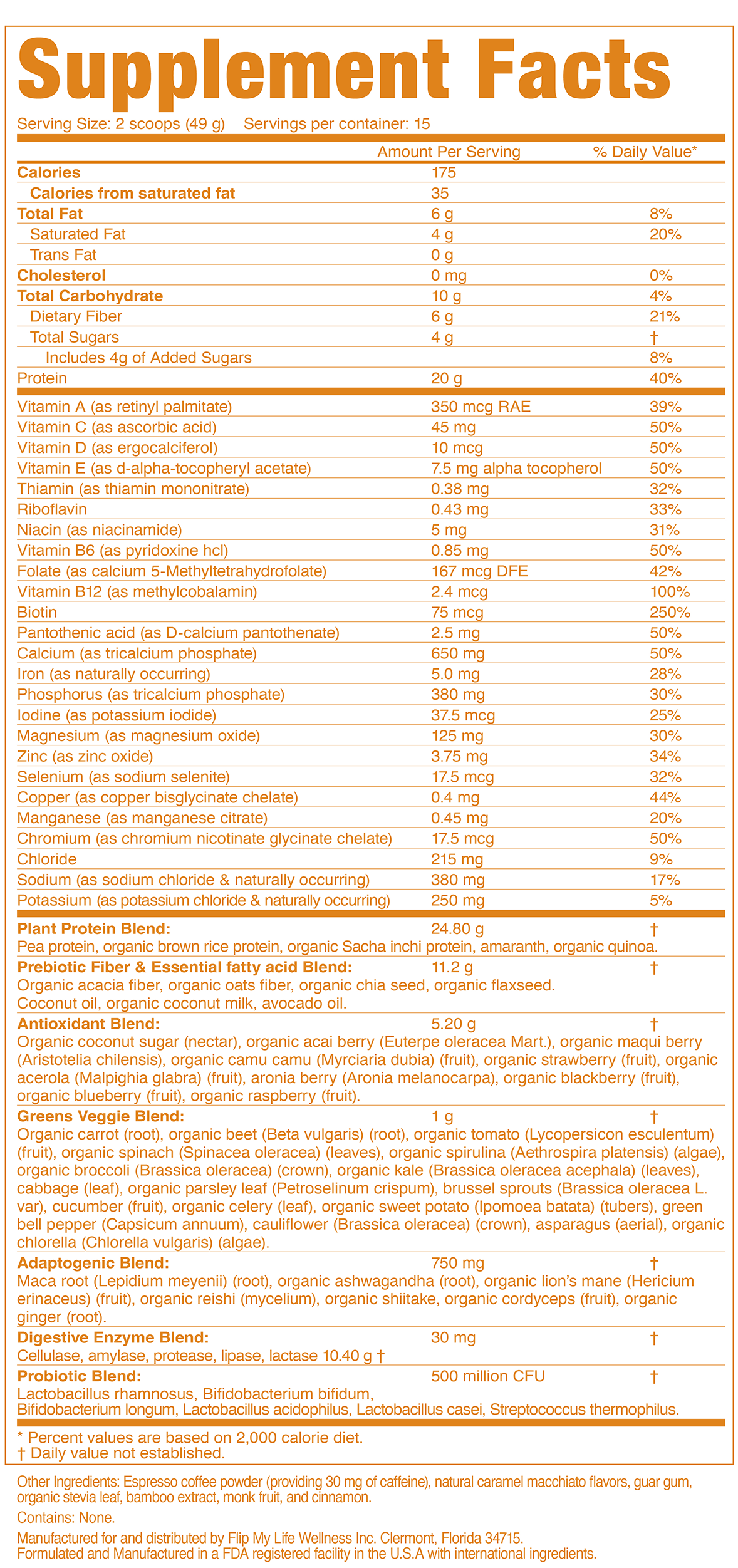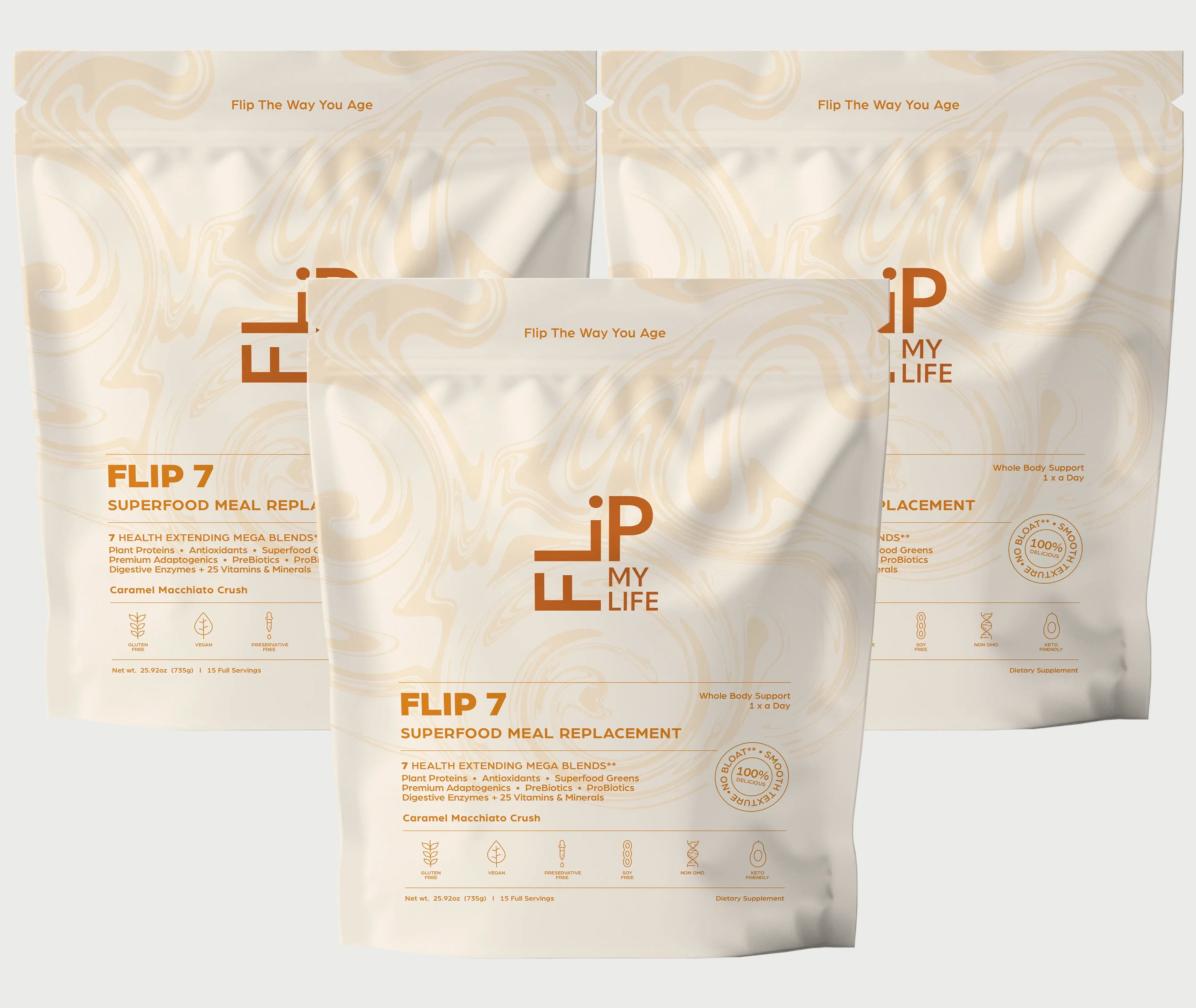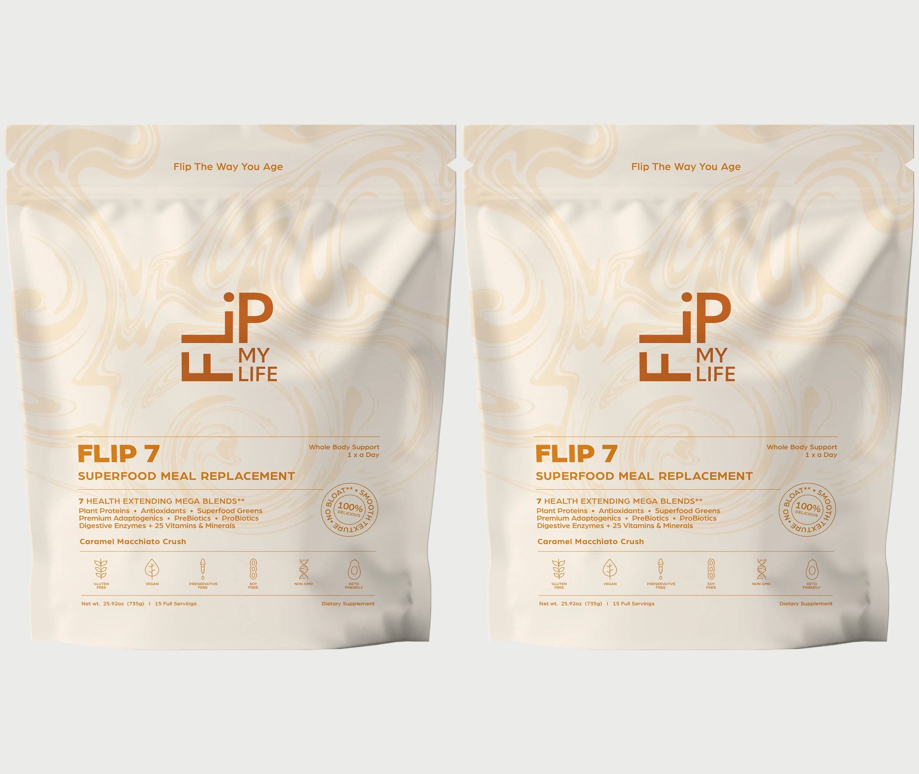 Feel better, fast with one shake a day. FLIP 7 is an unmatched, all-in-one meal replacement SUPER FOOD powder with the most nutrient rich balance of health extending blends formulated to support whole body and mind wellness.The vegan, plant based formula is made with proprietary doctor-tested blends and clean ingredients that work synergistically to enhance metabolism and provide all the super greens, adaptogens, prebiotics, probiotics, digestive enzymes, vitamins and minerals plus 20 grams of protein in each serving without bloat you get from other powders.No Bloat! 100% Delicious. Smooth, creamy texture.