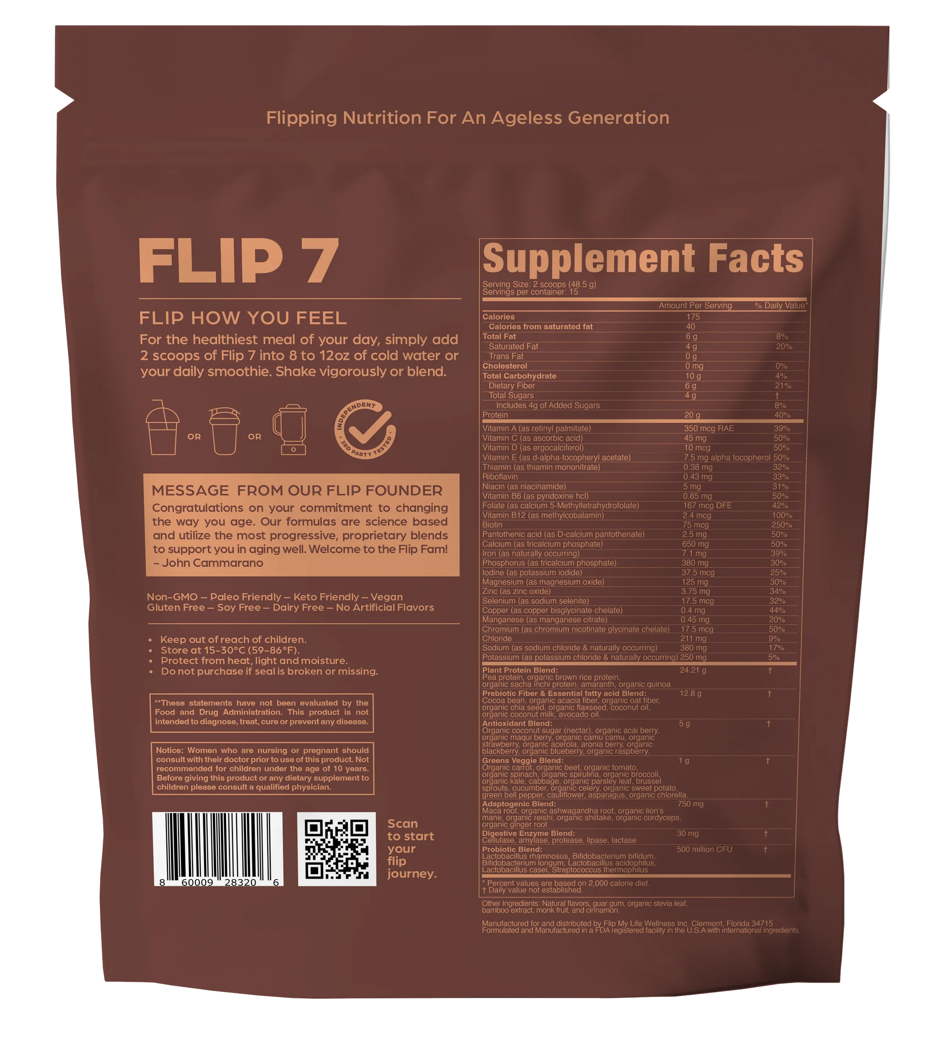 Feel better, fast with one shake a day. FLIP 7 is an unmatched, all-in-one meal replacement SUPERFOOD powder with the most nutrient rich balance of health extending blends formulated to support whole body and mind wellness. The vegan, plant based formula is made with proprietary doctor-tested blends and clean ingredients that work synergistically to enhance metabolism and provide all the super greens, adaptogens, prebiotics, probiotics, digestive enzymes, vitamins and minerals plus 20 grams of protein in each serving without bloat you get from other powders.No Bloat! 100% Delicious. Smooth, creamy texture.