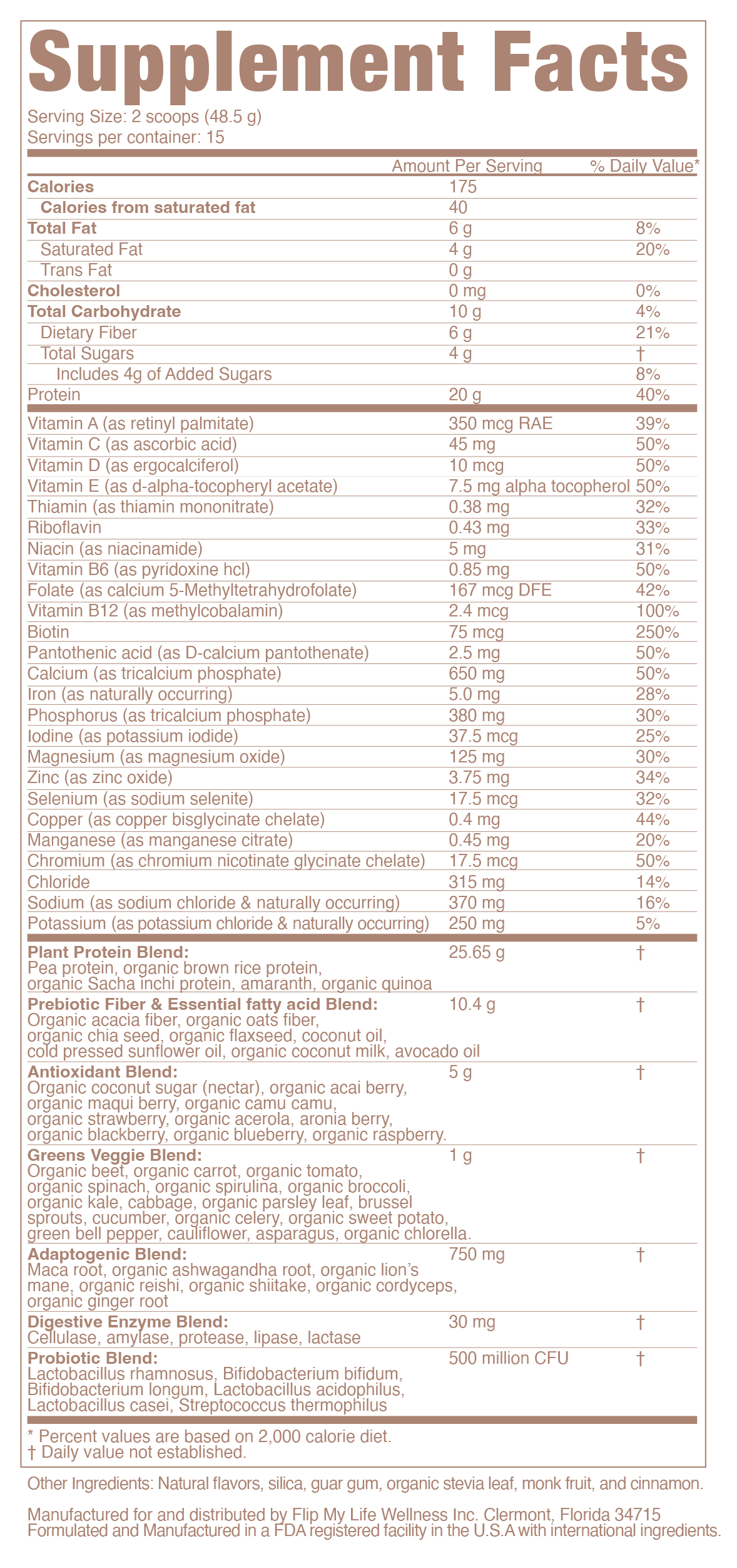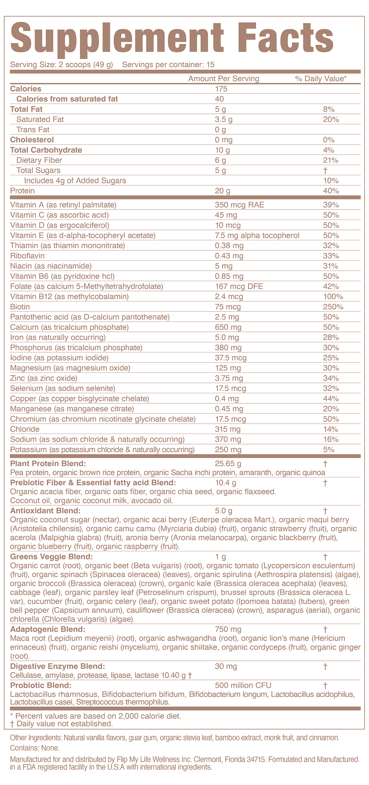 Feel better, fast with one shake a day. FLIP 7 is an unmatched, all-in-one meal replacement SUPERFOOD powder with the most nutrient rich balance of health extending blends formulated to support whole body and mind wellness. The vegan, plant based formula is made with proprietary doctor-tested blends and clean ingredients that work synergistically to enhance metabolism and provide all the super greens, adaptogens, prebiotics, probiotics, digestive enzymes, vitamins and minerals plus 20 grams of protein in each serving without bloat you get from other powders. No Bloat! 100% Delicious. Smooth, creamy texture.