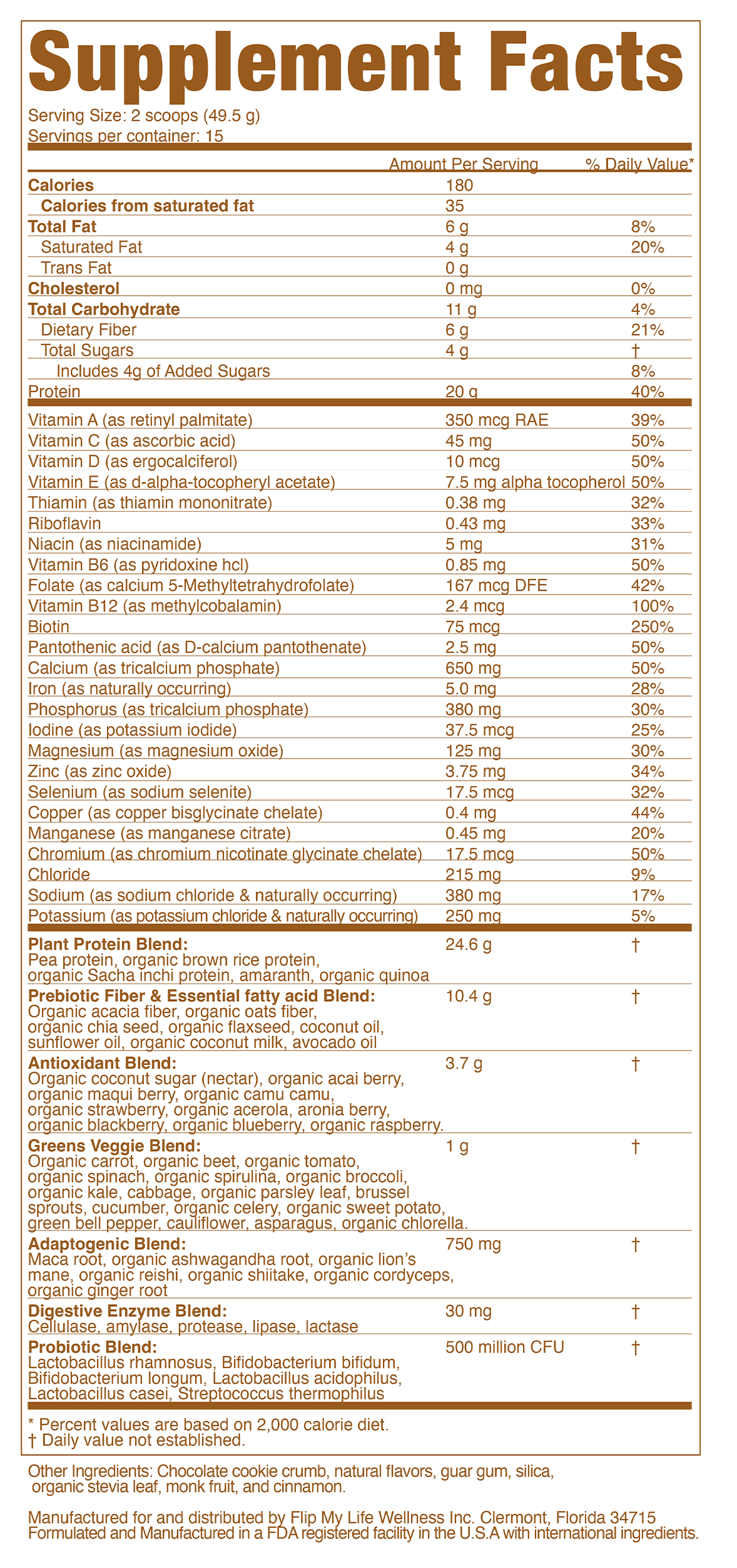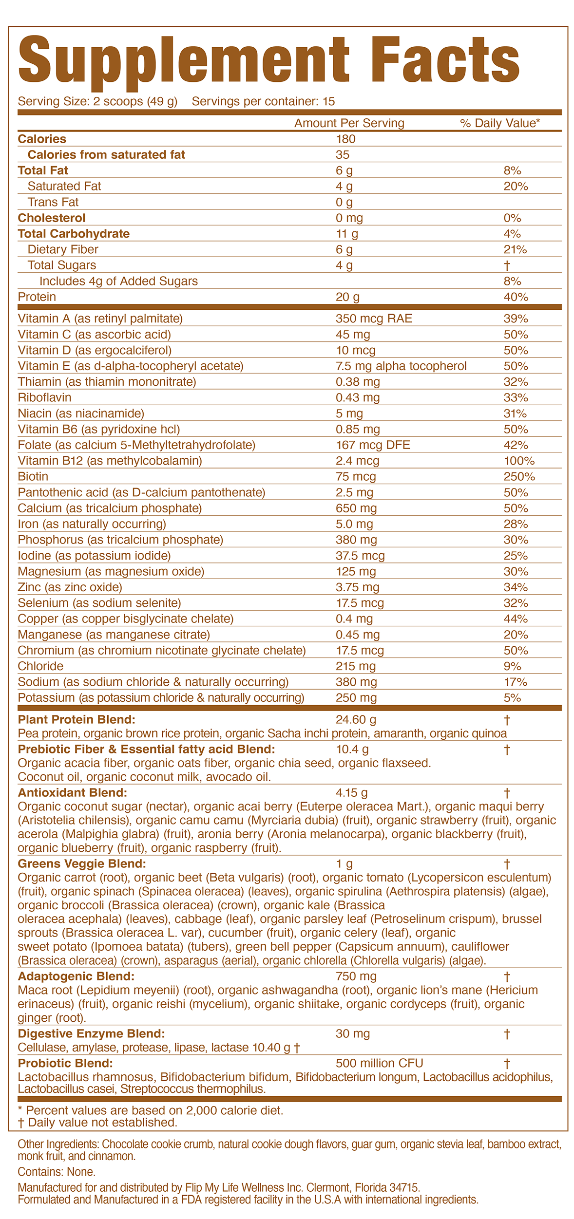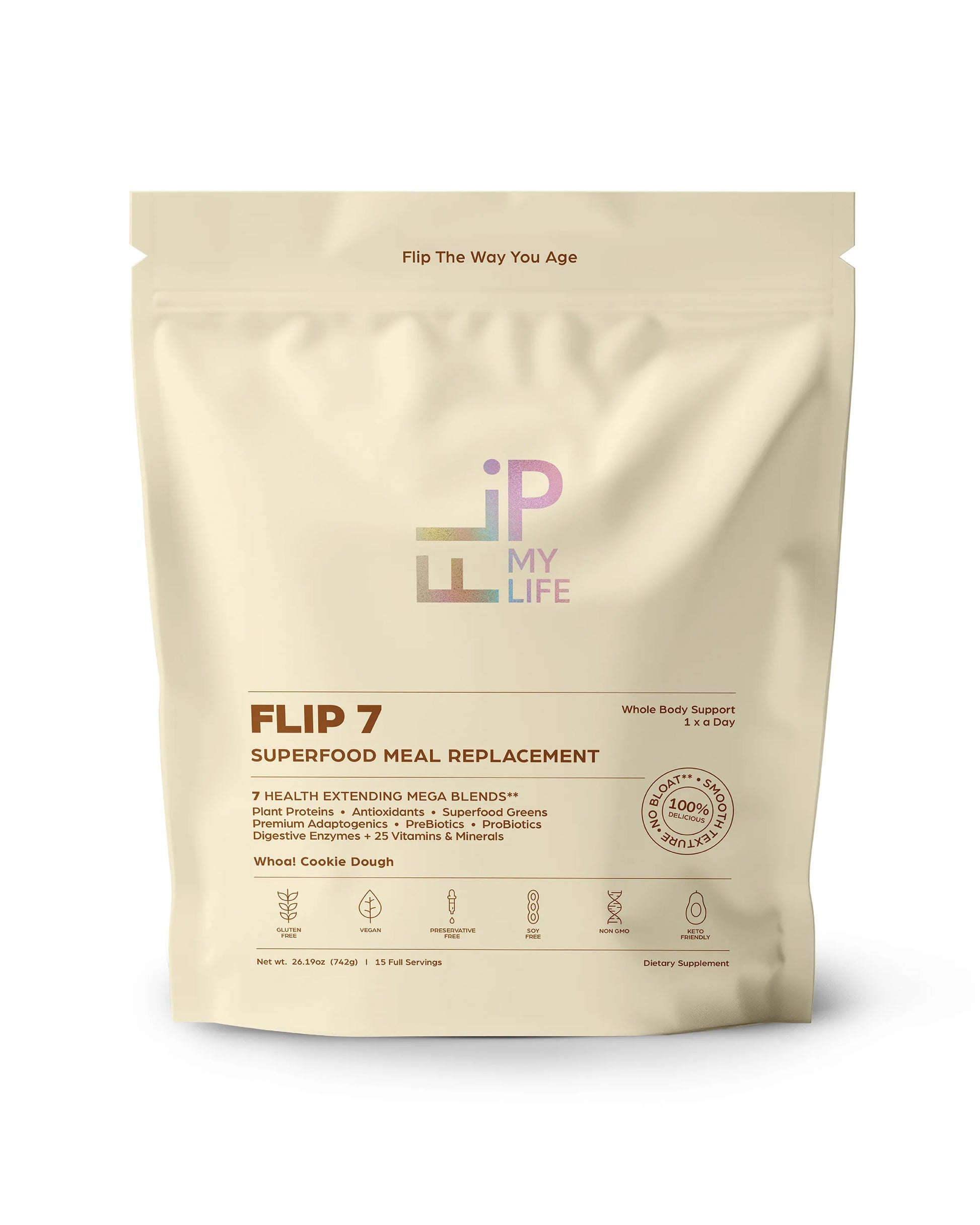 Feel better, fast with one shake a day. FLIP 7 is an unmatched, all-in-one meal replacement SUPER FOOD powder with the most nutrient rich balance of health extending blends formulated to support whole body and mind wellness.The vegan, plant based formula is made with proprietary doctor-tested blends and clean ingredients that work synergistically to enhance metabolism and provide all the super greens, adaptogens, prebiotics, probiotics, digestive enzymes, vitamins and minerals plus 20 grams of protein in each serving without bloat you get from other powders.No Bloat! 100% Delicious. Smooth, creamy texture.